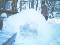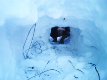 | かなり小さいですがカマクラを作成しました。 奥に居るのは「手伝ってくれた太郎」です 次回の蓼科時にはもっと大きなものを作成予定です (^-^) |