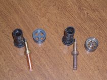 部屋に入った後、最初の作業は「風呂の蛇口のサーモの交換」です 写真は今まで使用していた物(右)と新品(左)です(銅の色の変化は分かりやすいですね) 最近の世情を示しているのか、金属部品がプラスチックに変更されていました
