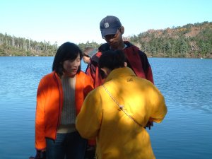 白駒池をバックに取った写真です 水はとてもきれいでした |